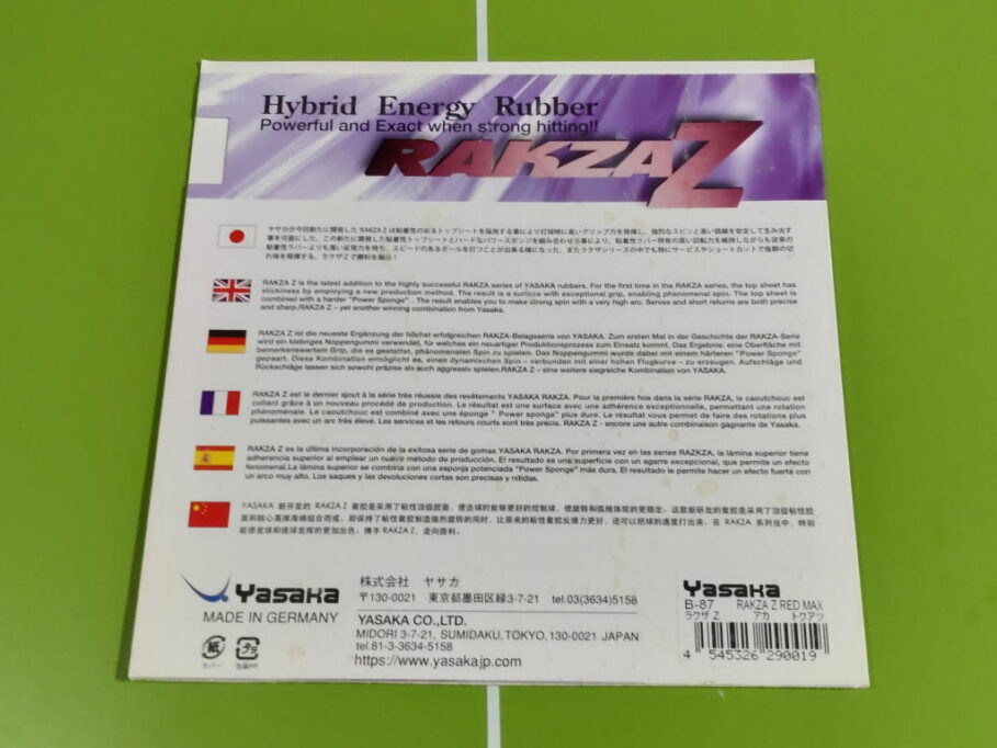 ヤサカ社からは初となる粘着タイプのドイツテンションラバー「ラクザZ」です トップ仕様の硬質なスポンジと反発力の強さが特徴でさらに粘着効果による高い回転性能を獲得したラバーとなっています
