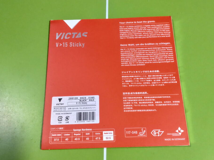 トップ仕様ドイツテンションとしてはすでに登場し、長くラインナップされている「V>15Extra(以降V>15)」ですが、微粘着タイプのラバーとして登場したのがこの「V>15 sticky(スティッキー)」です メーカーサイトでは「異端児」「V>15とは異なる性質を持つ」と記載されている通り、同名ラバーでありながら大きく異なる特徴を持つラバーとなっています